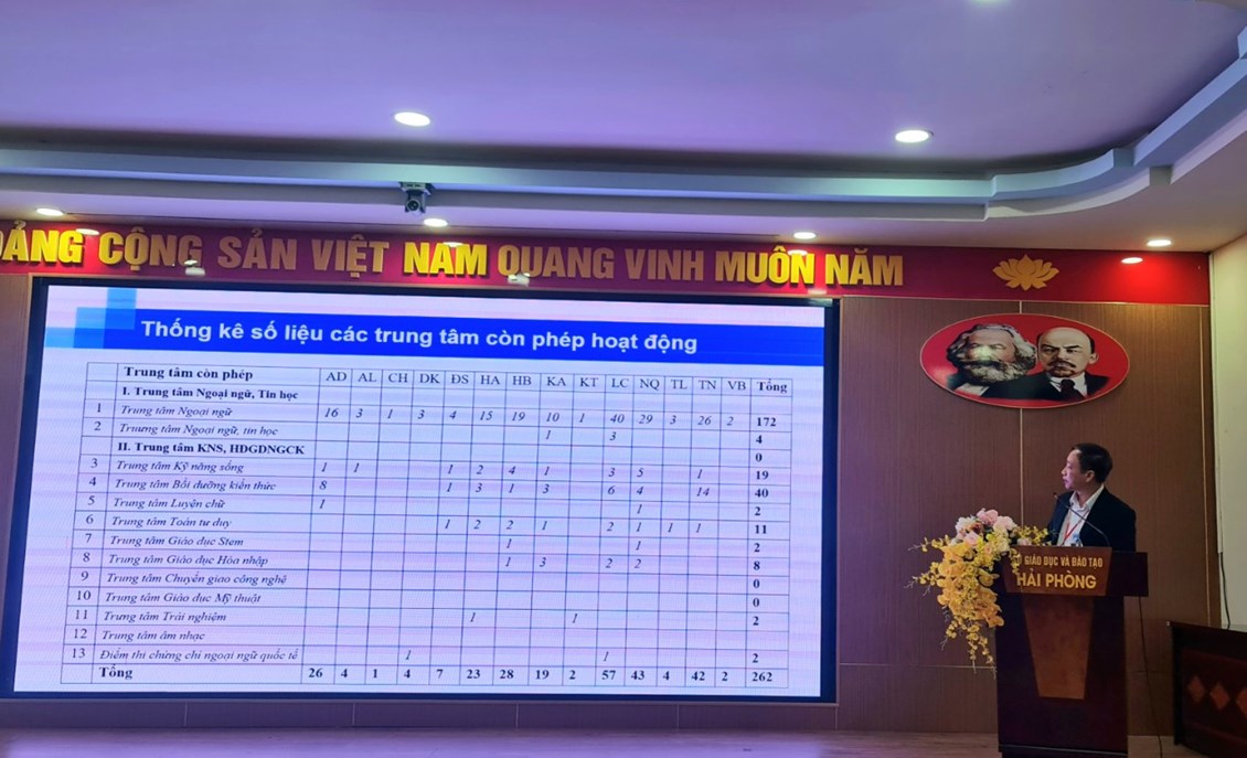 Đồng chí Nguyễn Anh Thuấn – trưởng phòng Giáo dục thường xuyên và đại học đã báo cáo tại Hội nghị về tình hình hoạt động của các doanh nghiệp hoạt động trong lĩnh vực GDĐT trên địa bàn toàn thành phố, đồng thời lưu ý về các văn bản của các cấp quản lý đối với các trung tâm tin học, ngoại ngữ, kĩ năng sống,… Theo đồng chí Đỗ Anh Thuấn, số lượng trung tâm ngày càng tăng, chất lượng hoạt động ngày càng được chú trọng, đáp ứng nhu cầu xã hội, thu hút lượng học viên đông. Công tác quản lý nhà nước của Sở GDĐT ngày càng bài bản, khoa học, chặt chẽ, đảm bảo tính pháp lý trong hoạt động của các trung tâm. Tuy nhiên, vẫn còn các tồn tại như hiện tượng các trung tâm chưa báo cáo kịp thời về các thay đổi nhân sự, địa điểm; cá biệt còn có trung tâm họa động không phép hoặc chưa đáp ứng quyền lợi của người học, giáo viên theo cam kết ban đầu,…