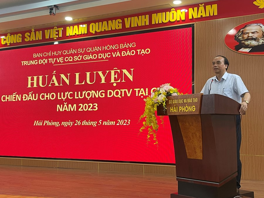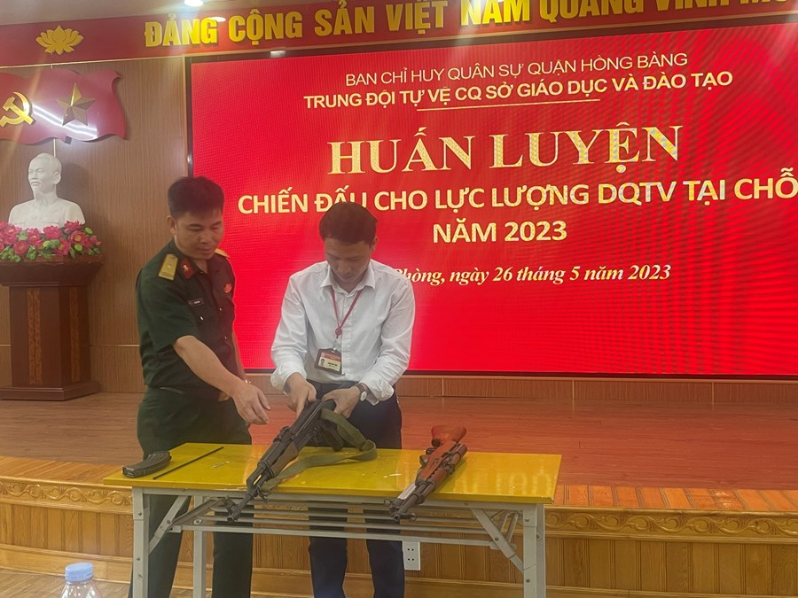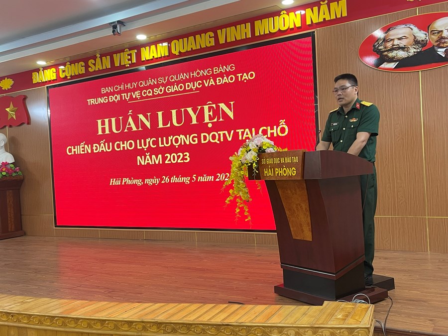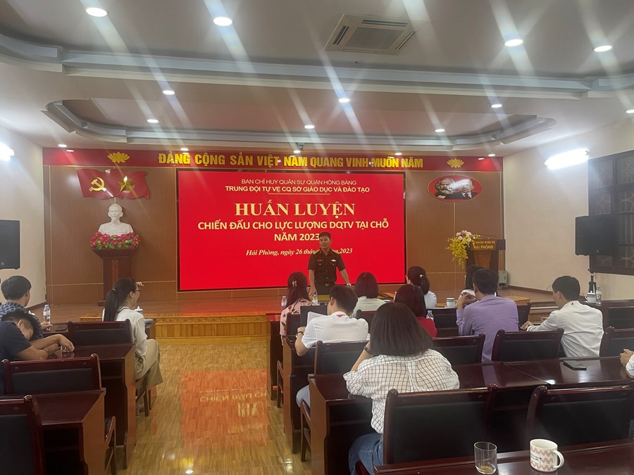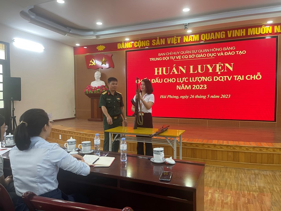 Thực hiện Kế hoạch số 36/KH-BCH về huấn luyện chiến đấu giai đoạn 1 năm 2023 của Bộ chỉ huy quân sự thành phố Hải Phòng; Kế hoạch số 279/KH-BCH ngày 21/4/2023 của Ban chỉ huy quân sự quận Hồng Bàng, Ban chỉ huy lực lượng tự vệ cơ quan Sở Giáo dục và Đào tạo đã kịp thời xây dựng kế hoạch huấn luyện trong thời gian 7 ngày từ ngày 22/5-30/5/2023, tổ chức huấn luyện chiến đấu tại chỗ năm 2023 cho toàn bộ chiến sĩ tự vệ của cơ quan, với mục tiêu huấn luyện cho chiến sĩ của đơn vị tự vệ tại chỗ nắm chắc kiến thức cơ bản về vị trí, vai trò, nhiệm vụ của dân quân tự vệ, nhiệm vụ Quốc phòng Quân sự địa phương năm 2023, các nội dung về kỹ thuật, chiến thuật đảm bảo đạt chất lượng, hiệu quả và đúng theo quy định.