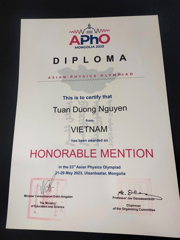 Em Nguyễn Tuấn Dương (Lớp 12 Lý, Trường THPT Chuyên Trần Phú thành phố Hải Phòng) nhận Bằng khen tiếp tục cùng đội tuyển QG tham dự cuộc thi Olympic Vật lý quốc tế tại Nhật Bản.