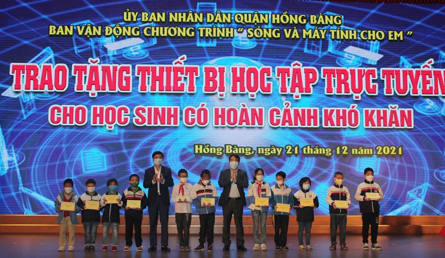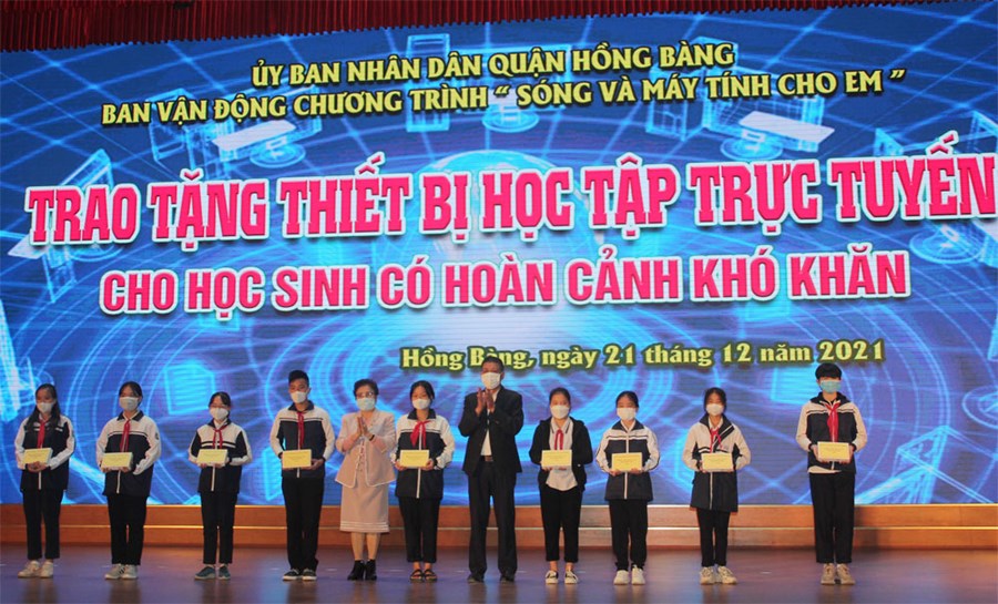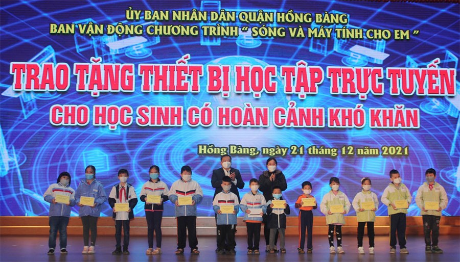 Sau 2 tuần phát động Chương trình “Sóng và máy tính cho em”, với số kinh phí và hiện vật vận động được, hôm nay, Quận Hồng Bàng tổ chức trao tặng thiết bị học tập trực tuyến cho học sinh có hoàn cảnh khó khăn đợt 1 bao gồm: Hỗ trợ Chương trình “Sóng và máy tính cho em” của thành phố 120 triệu đồng. Trao tặng máy tính bảng và Sim 4G cho 55 em học sinh có hoàn cảnh đặc biệt khó khăn của các trường TH, THCS, THPT với tổng trị giá 220 triệu đồng. Trao tặng hiện vật tiếp nhận đợt 1 cho 46/65 học sinh khó khăn của Trường Tiểu học Ngô Gia Tự (do trường Tiểu học Ngô Gia Tự trực tiếp vận động được).