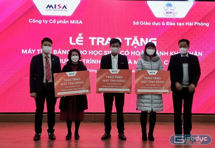 Tại buổi lễ, gần 455 máy tính bảng được Công ty Cổ phần MISA trao tặng cho các học sinh tiểu học và trung học cơ sở thuộc hộ nghèo, cận nghèo tại quận Lê Chân, huyện Kiến Thuỵ, huyện Cát Hải (thành phố Hải Phòng).