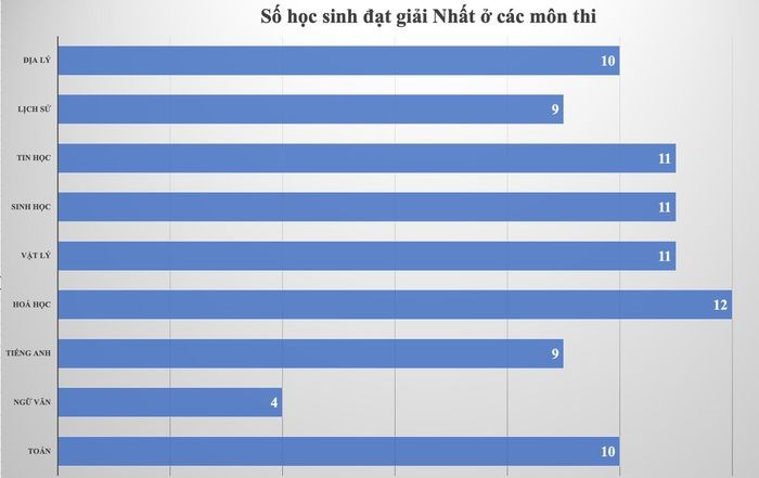 Kết quả các môn cụ thể là: Toán (02 giải Nhì, 04 giải Ba, 03 giải KK); Vật lý (04 giải Nhì, 01 giải Ba, 01 giải KK); Hóa học (01 giải Nhất, 04 giải Ba); Sinh học (01 giải Nhất, 01 giải Nhì, 03 giải Ba, 02 giải KK); Tin học (01 giải Nhì, 01 giải Ba, 04 giải KK); Ngữ văn (05 giải Ba, 03 giải KK); Lịch sử (01 giải Nhất, 05 giải Nhì, 02 giải Ba); Địa lý (03 giải Nhất, 05 giải Nhì, 01 giải Ba); Tiếng Anh (01 giải Nhất, 04 giải Nhì, 03 giải Ba); Tiếng Pháp (05 giải Nhì, 04 giải Ba, 01 giải KK) ; Tiếng Nga (02 giải Nhì, 02 giải KK); Tiếng Trung (02 giải Nhì, 01 giải Ba, 02 giải KK)