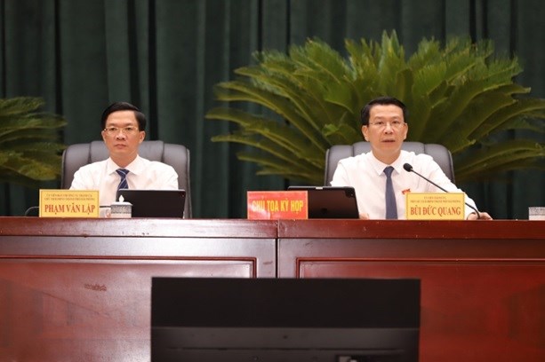 Đồng chí Phạm Văn Lập, Chủ tịch HĐND thành phố và đồng chí Bùi Đức Quang, Phó Chủ tịch HĐND thành phố điều hành phiên họp.