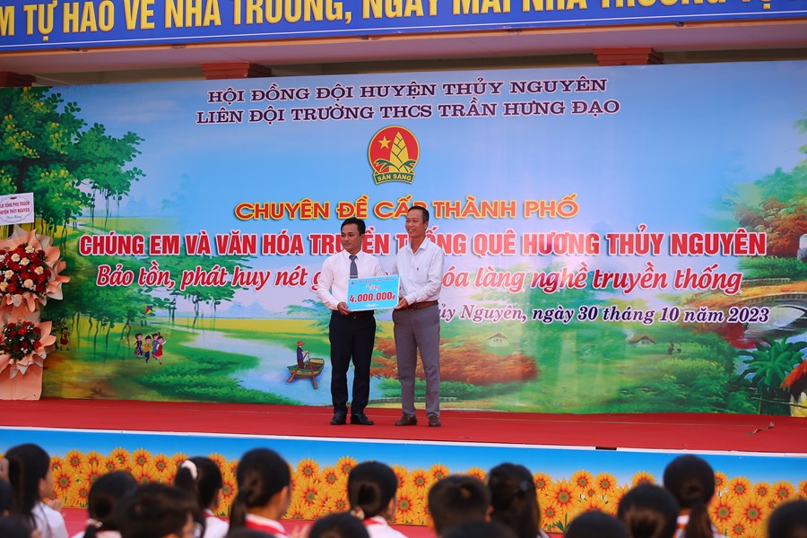 Liên đội Trường THCS Trần Hưng Đạo là đơn vị tổ chức đầu tiên Chuyên đề Đội, chuyên đề tạo mẫu cấp thành phố năm học 2023- 2024, tạo ra sự mới mẻ, hứng khởi, giúp giáo viên và học sinh các trường được giao lưu, học hỏi, chia sẻ kinh nghiệm trong tổ chức các hoạt động, góp phần nâng cao chất lượng, hiệu quả nhằm bảo tồn, phát huy nét giá trị văn hóa làng nghề truyền thống của quê hương Thủy Nguyên. Chuyên đề thực hiện gồm các nội dung: Giới thiệu Văn hóa truyền thống quê hương, làng nghề gói bánh chưng Thủy Đường, làng nghề đan mây tre Chính Mỹ và biểu diễn bằng hình thức sân khấu hóa “Cội nguồn văn hóa” do các em Liên đội Trường THCS Trần Hưng Đạo thực hiện; Hoạt động tham quan trải nghiệm tại các gian trưng bày sản phẩm làng nghề gói bánh chưng, đan tre và cùng đi chợ Giá huyện Thủy Nguyên. Qua từng phần thiệu và quảng bá của các em học sinh Trường THCS Trần Hưng Đạo đã góp phần bảo tồn, phát huy nét giá trị văn hóa làng nghề truyền thống quê hương Thủy Nguyên, từ đó, làm nổi bật lên những tiềm năng, thế mạnh và những nét văn hóa đặc sắc, độc đáo, riêng có của huyện Thủy Nguyên. Qua đó định hướng nghề nghiệp cho các em học sinh sau này.