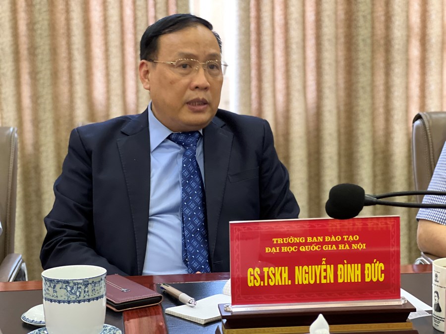 GS.TSKH Nguyễn Đình Đức, Trưởng Ban Đào tạo khẳng định uy tín của ĐHQG Hà Nội, dù thời gian thành lập chưa dài, nhưng trên cơ sở nghiên cứu đã xây dựng bộ tiêu chí đánh giá năng lực riêng, ngày càng hoàn thiện, có độ tin cậy, thực chất và giá trị tuyển lựa rất cao. Nội dung thi thời gian tới bám sát chương trình GDPT 2018. Hiện nay, đã có 66 trường Đại học trong cả nước sử dụng kết quả đánh giá năng lực của Trung tâm Khảo thí và đánh giá năng lực - ĐHQG Hà Nội để tuyển sinh, trong đó, có nhiều Đại học lớn và uy tín. Hoạt động của Trung tâm Khảo thí và đánh giá năng lực - ĐHQG Hà Nội có vai trò thúc đẩy đổi mới ở các Trường Đại học trong cả nước. Giáo sư Đức trao đổi thêm về nội dung hợp tác phát triển giữa ĐHQG Hà Nội với các trường THPT chuyên; vấn đề dạy, học và đánh giá năng lực ngoại ngữ giáo viên và học sinh, nhấn mạnh quan điểm muốn hỗ trợ về mọi mặt cho Hải Phòng xây dựng Điểm đánh giá năng lực của ĐHQG Hà Nội.