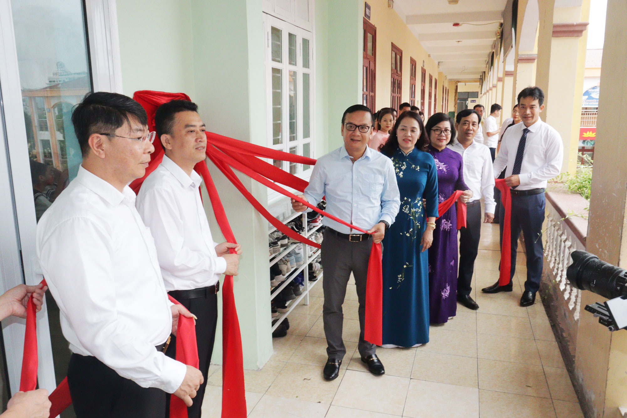 Các đại biểu làm Lễ gắn biển công trình “Phòng học chuyển đổi số”.“Phòng học chuyển đổi số” của Trường hướng tới mục tiêu nâng cao hiệu quả dạy và học, cập nhật cho học sinh tiếp cận sớm với các thành tựu của thời đại trong bối cảnh giáo dục thời đại số. Qua đó, học sinh sẽ học tập chủ động, sáng tạo, phát triển toàn diện hơn; giáo viên cũng sẽ có thêm công cụ, động lực để đổi mới phương pháp, nâng tầm chất lượng.