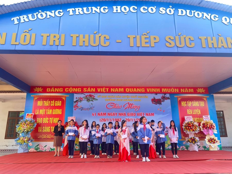 Nhà trường đã tặng hoa, quà cho các thế hệ Nhà giáo để bày tỏ lòng tri ân về những cống hiến, đóp góp thầm lặng của các Thầy/Cô trong suốt sự nghiệp trồng Người, gắn bó với nhà trường từ những năm tháng trường còn nhiều khó khăn, thiếu thốn để giờ đây, Trường THCS Dương Quan đã có nhiều tiến bộ vượt bậc cả về quy mô, chất lượng giáo dục và cơ sở vật chất, cảnh quan nhà trường. Không khí của buổi kỷ niệm lặng đọng khi nghe em Đào Nguyễn Kim Ngân, học sinh lớp 9A1, đại diện cho gần 700 học sinh nhà trường tham dự bày tỏ cảm xúc của mình để tri ân các Thầy/Cô khi những năm tháng học dưới mái trường THCS Dương Quan yêu dấu không còn bao lâu nữa.