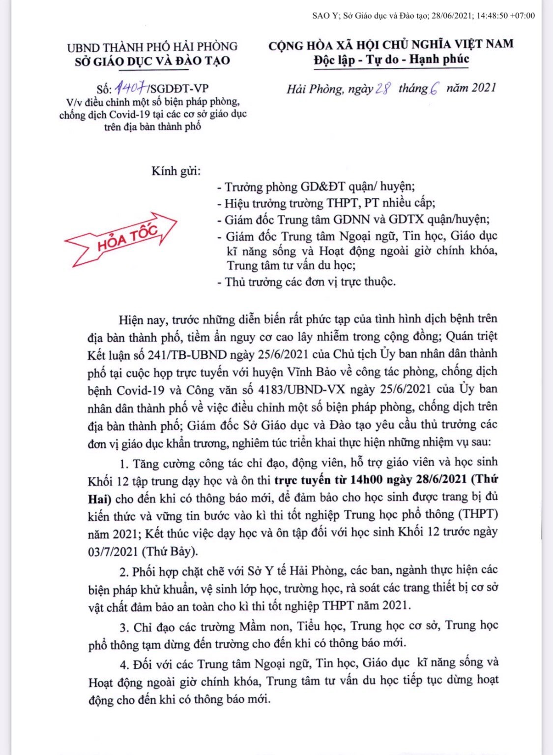 Hỏa tốc: Về việc điều chỉnh một số biện pháp phòng, chống dịch Covid-19 tại các cơ sở giáo dục trên địa bàn thành phố